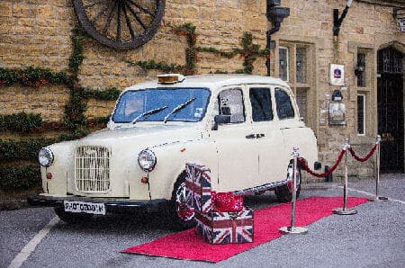 One of our range of taxi cab photos booths, this one in stunning Old English White, perfect for weddings, parties and Christmas themed events.